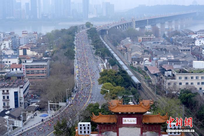 图为参赛选脚奔腾正在武汉少江年夜桥上。中新社记者 弛畅 摄